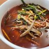 生卵がサービスでつくので、味の変化と辛い時にマイルドにするためにもっていく。そばの上に、肉と大量のごま、そして刻み海苔。