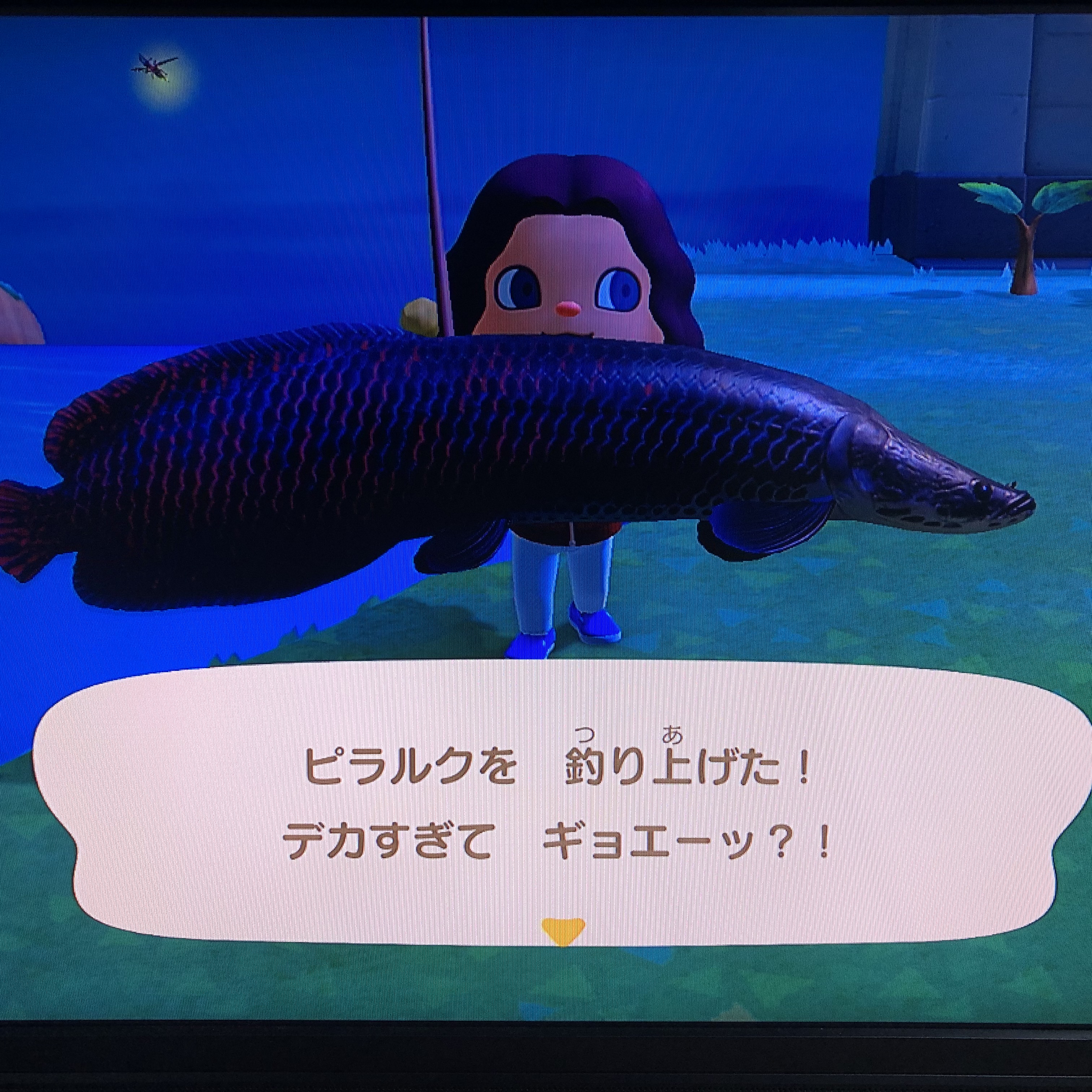 ピラルクを釣り上げた 2020/7/9 ゲーム あつまれどうぶつの森で、ピラルクを釣り上げた。釣り上げたのは、夜で、川に大きな魚のシルエットでゆらゆらしていたものだ。 ゲームの中じゃなくて、現実世界でも釣り上げてみたいものだ。