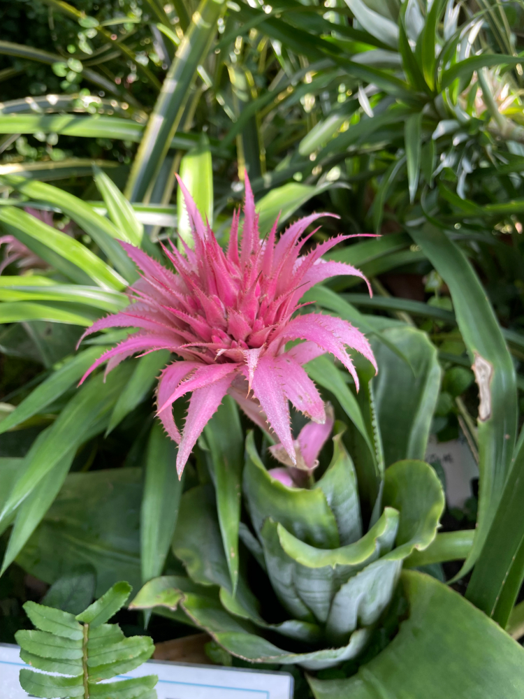 トゲトゲの球体になっている植物から、すらっと伸びた茎の先に花がついていた。個体は、とても大きいのだけど、1つ1つの花は小さく、咲いていない部分もあった。これは、なかなかおもしろい植物だった。