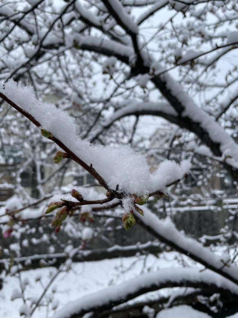 積もるほど雪が降った。真間川の早咲き桜の様子を見てきたら、花も蕾も雪をかぶっていた。これはこれで乙な感じだった。