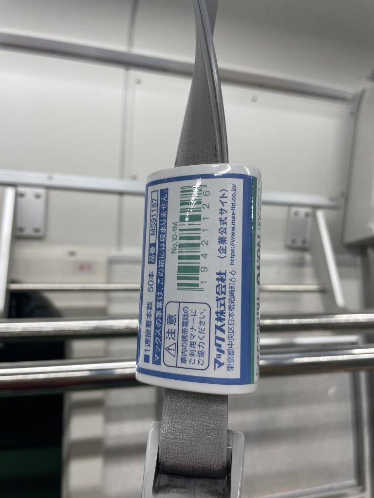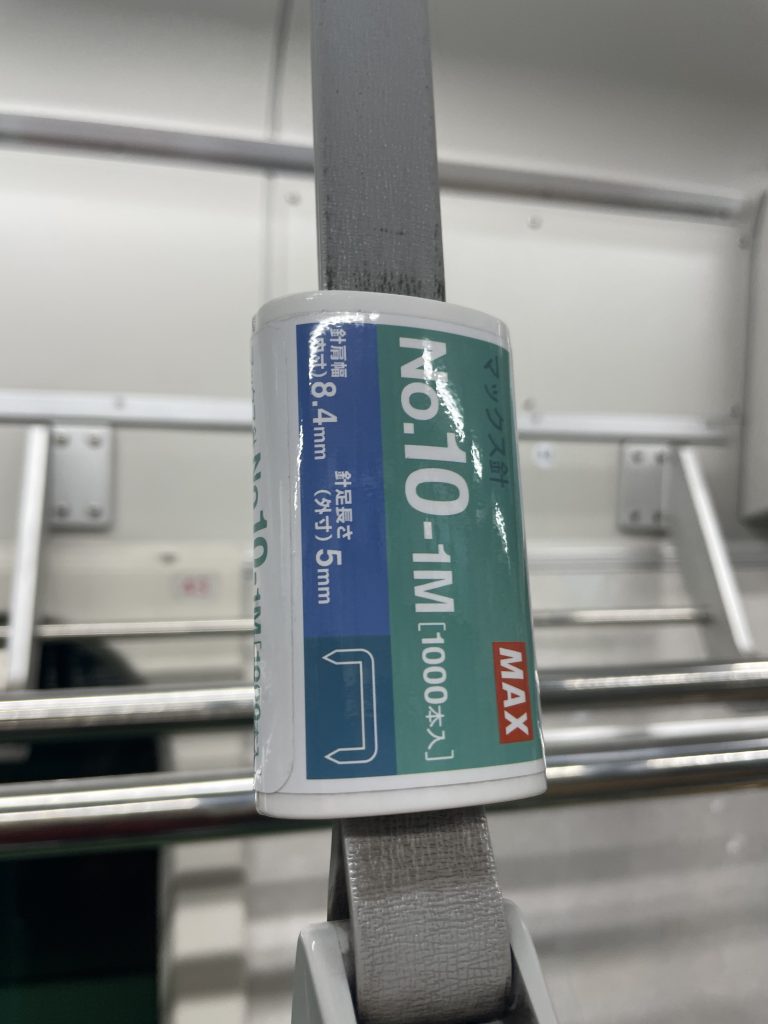 広告で、都営新宿線の車両の吊り革がマックス針(ホッチキスの針、ホッチキスは登録標章だからステープラー針が正しいか)になっていた。